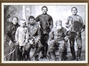 Фото групповое (6 чел.) на паспарту серого цвета с рельефным точечным рисунком по краю. На фоне светлого панно с геометрическим рисунком свободно размещены портретируемые в два ряда. В 1-м ряду – сидит справа Гусевской Елизар Гаврилович, основатель станицы Черняева, слева сидит Гусевская (Лунина) Васса Ионовна (1862 – 1919 гг., невестка Елизара Гавриловича), рядом стоит Елизар (1903 – 1991 гг., внук Елизара Гавриловича), рядом с Елизаром (внуком) сидит Гавриил (1857 – 1924 гг., сын Елизара Гавриловича). Во втором ряду стоят двое (имена не установлены); первый справа держит гармонь.